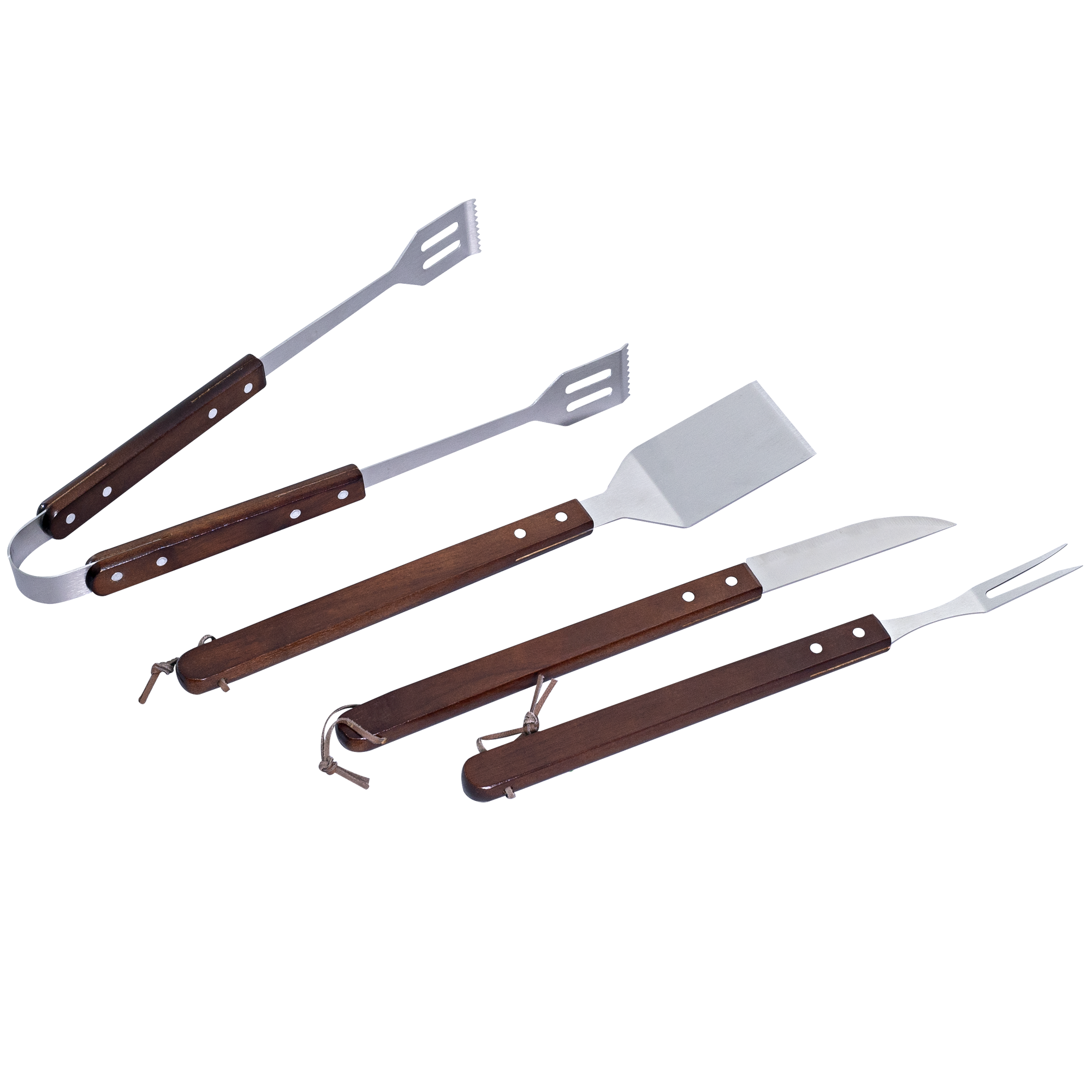 O BBQ Prokit Montana é um conjunto de utensílios de aço inoxidável para churrasco, que inclui as ferramentas essenciais para qualquer churrasqueiro: uma faca, uma pinça, uma espátula e um garfo grande.
