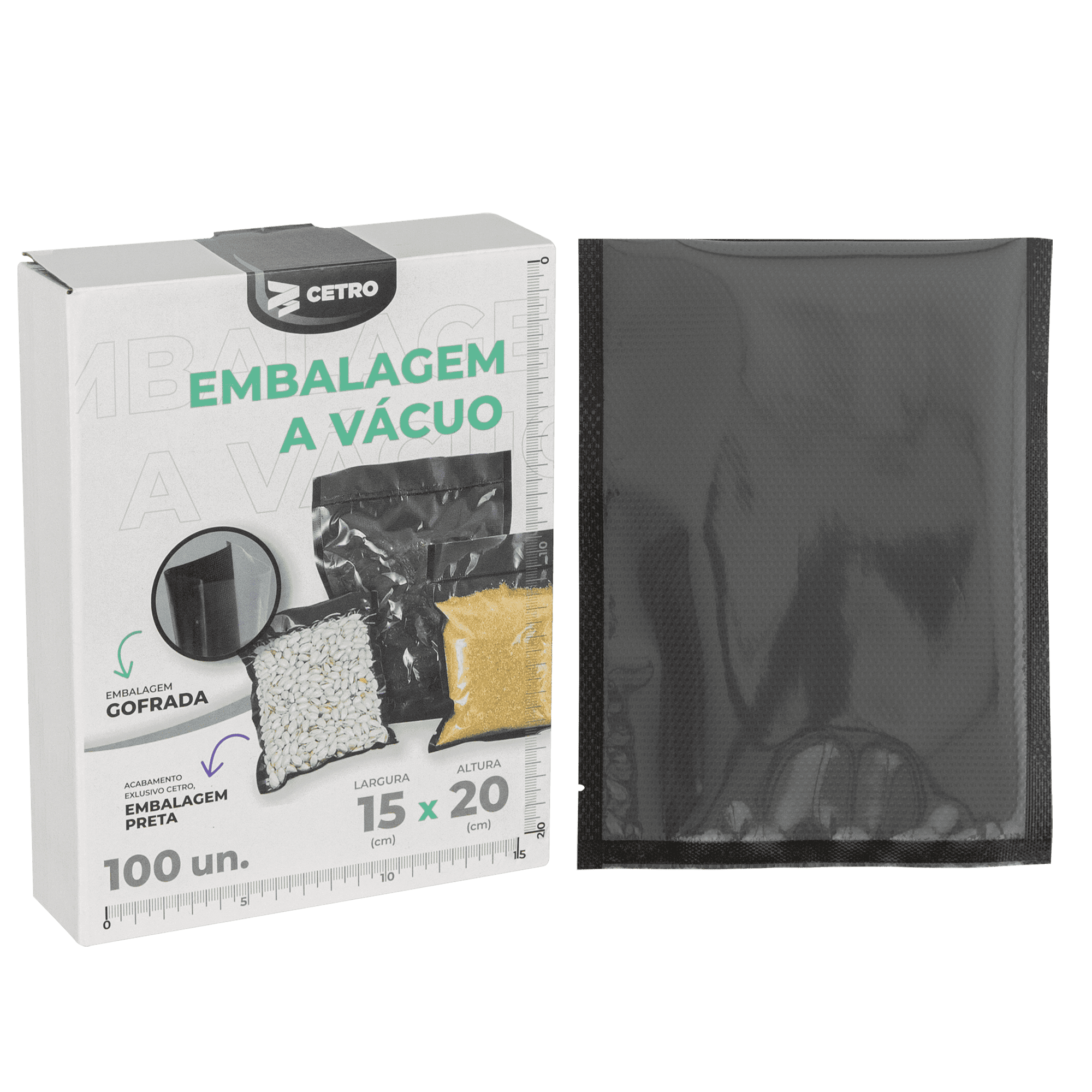 As embalagens gofradas pretas da Cetro são produzidas com alta tecnologia em Nylon Poli e são livres de bisfenol A, seguindo padrões de qualidade internacional. Com 27 micras e 3 barreiras de proteção, elas podem ser utilizadas em qualquer seladora a vácuo que aceite embalagens gofradas.