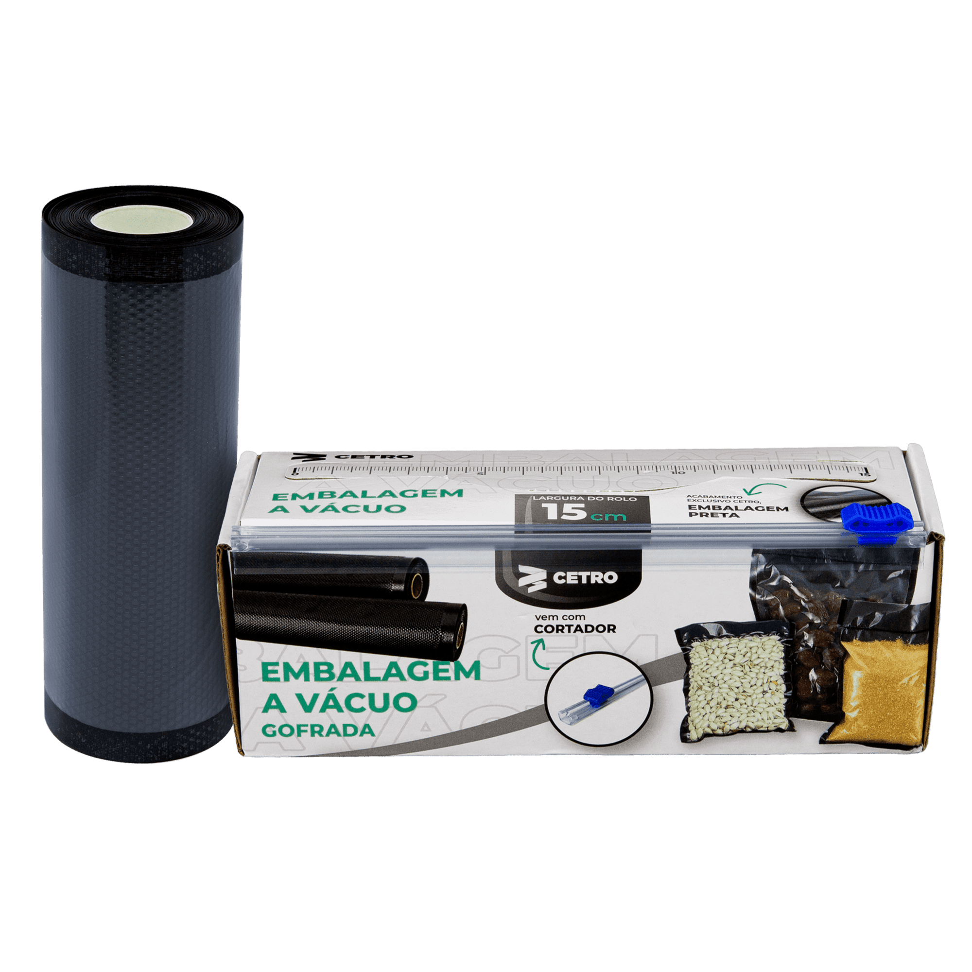 Embalagem a Vácuo 15x500cm Gofrada Preta em Rolo e Caixa com Cortador