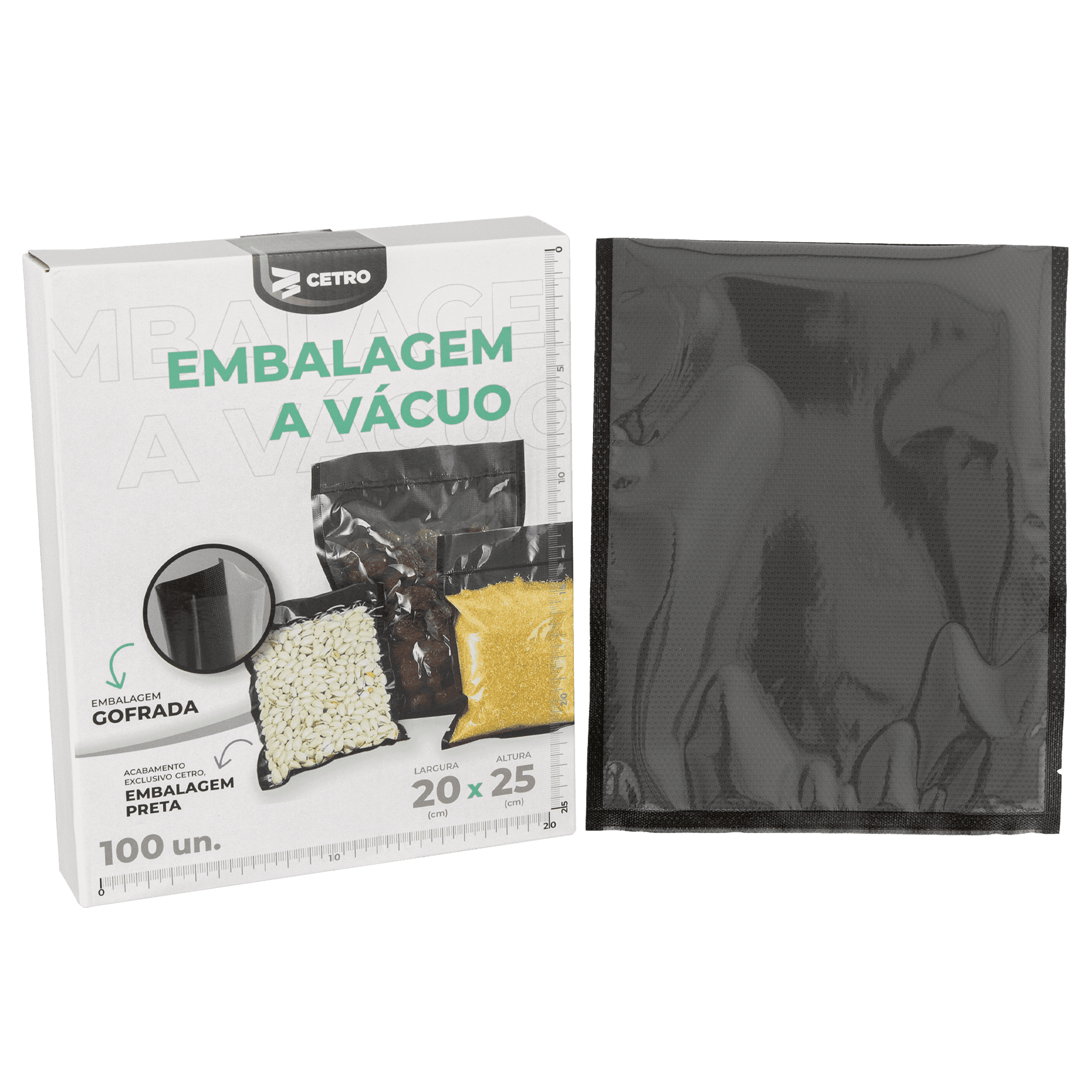 As embalagens gofradas pretas da Cetro são produzidas com alta tecnologia em Nylon Poli e são livres de bisfenol A, seguindo padrões de qualidade internacional. Com 27 micras e 3 barreiras de proteção, elas podem ser utilizadas em qualquer seladora a vácuo que aceite embalagens gofradas.