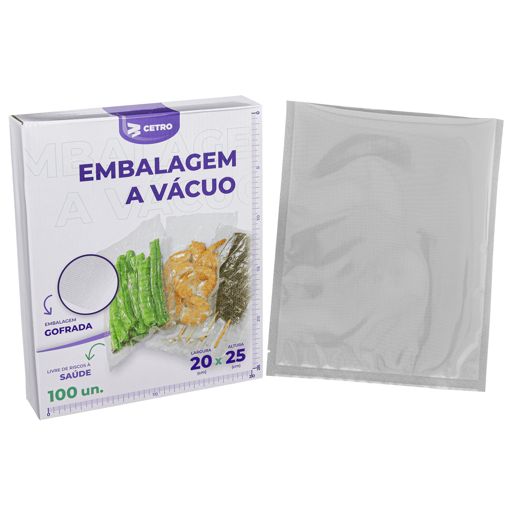 As embalagens gofradas transparentes da Cetro são produzidas com alta tecnologia em Nylon Poli e são livres de bisfenol A, seguindo padrões de qualidade internacional. Com 27 micras e 3 barreiras de proteção, elas podem ser utilizadas em qualquer seladora a vácuo que aceite embalagens gofradas.