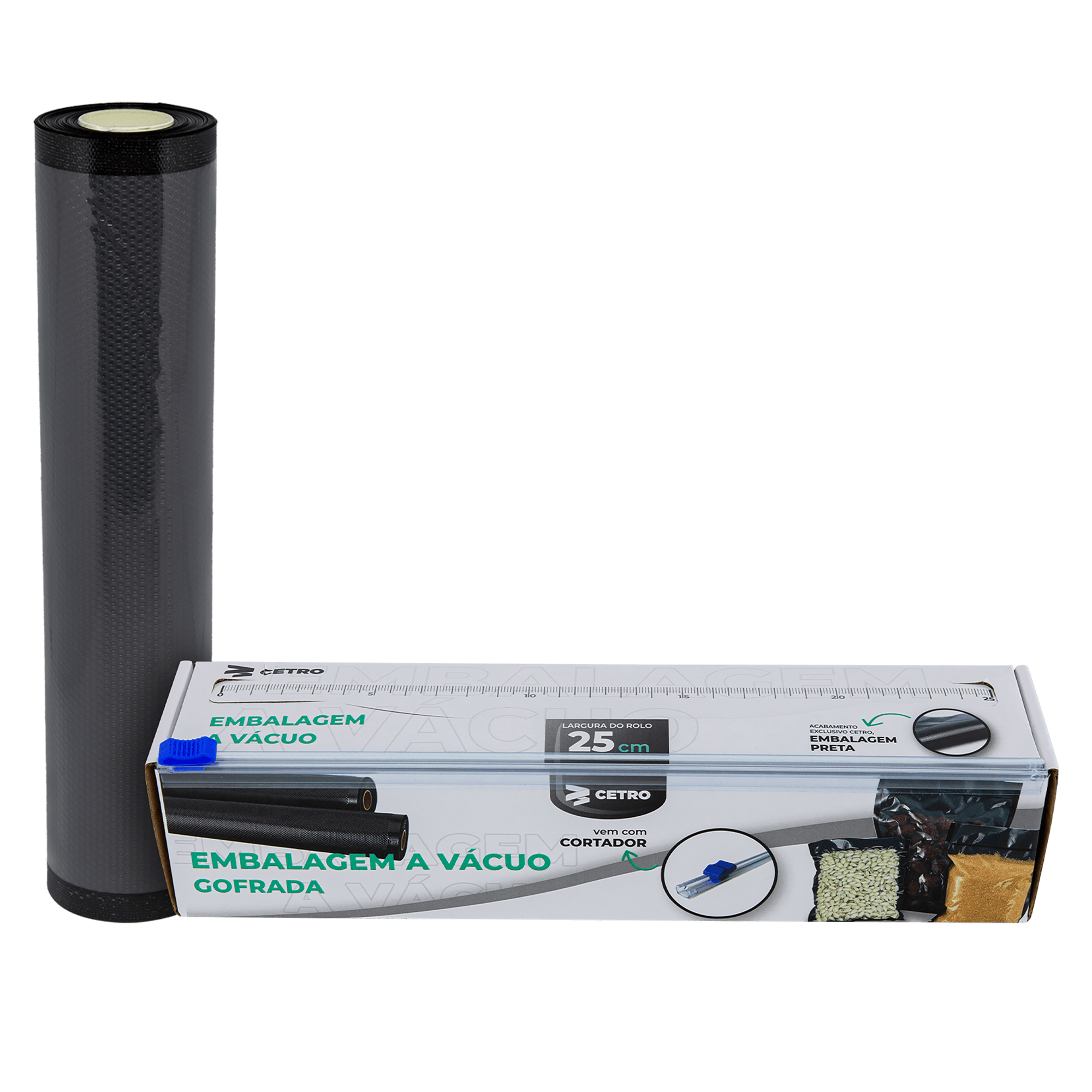 Embalagem a Vácuo 25x500cm Gofrada Preta em Rolo e Caixa com Cortador