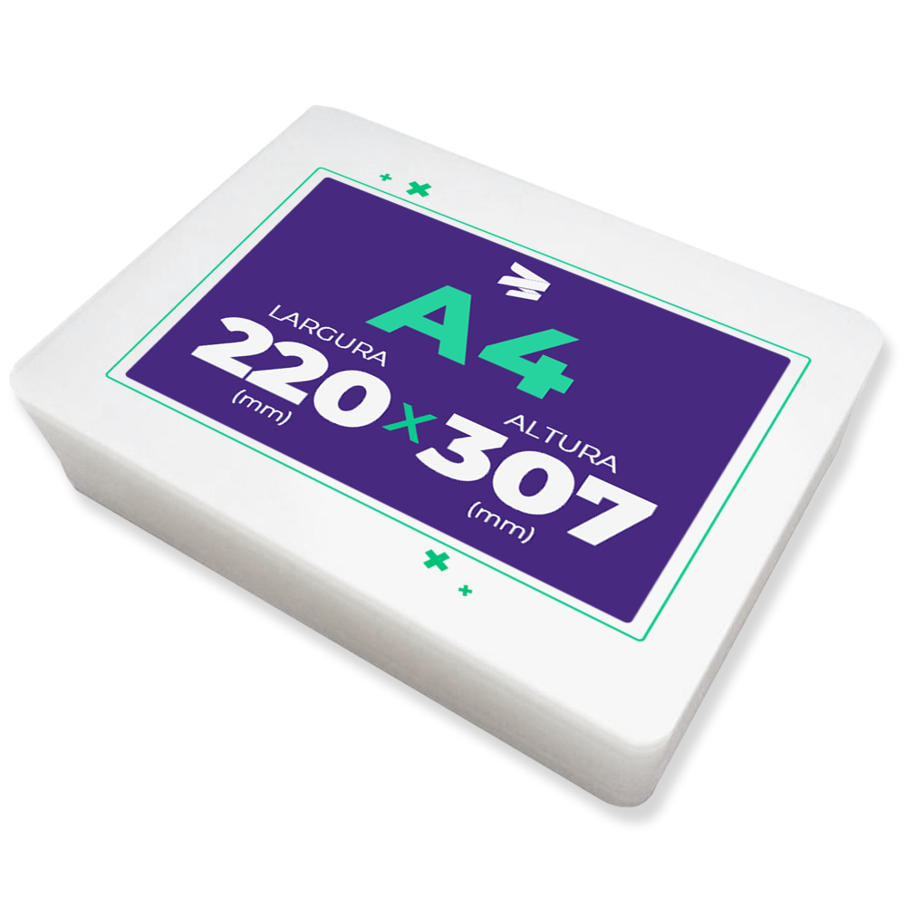 O plástico é ideal para a utilização em plastificadoras a quente, fornecendo excelente acabamento e plastificação perfeita. Com acabamento profissional, totalmente transparente e brilhante, é fornecido no tamanho correto para plastificar A4.